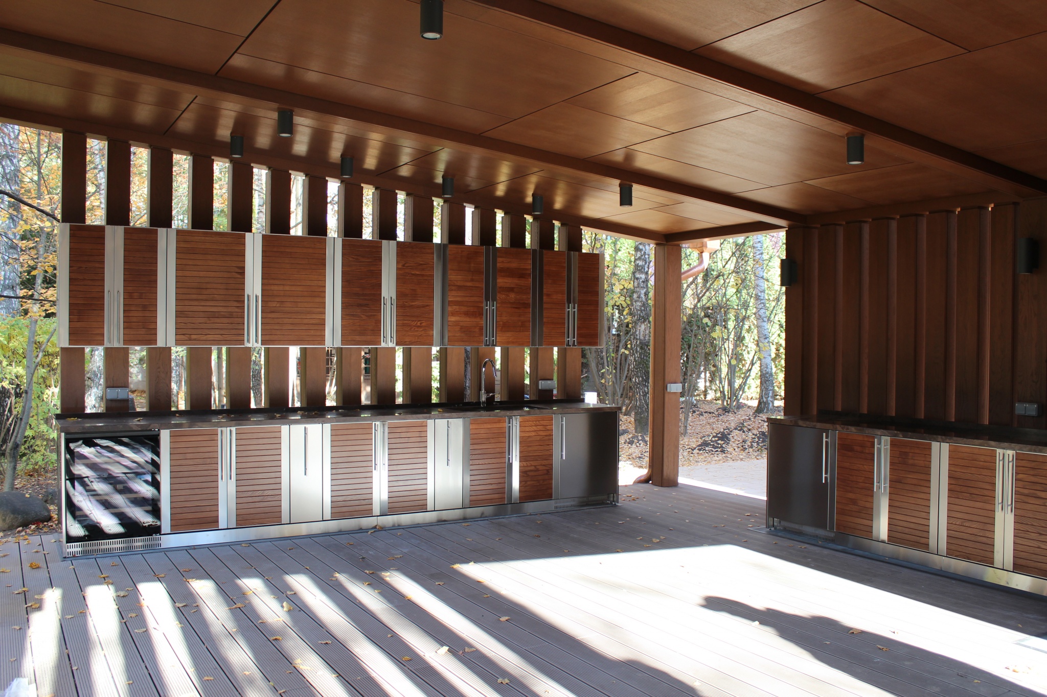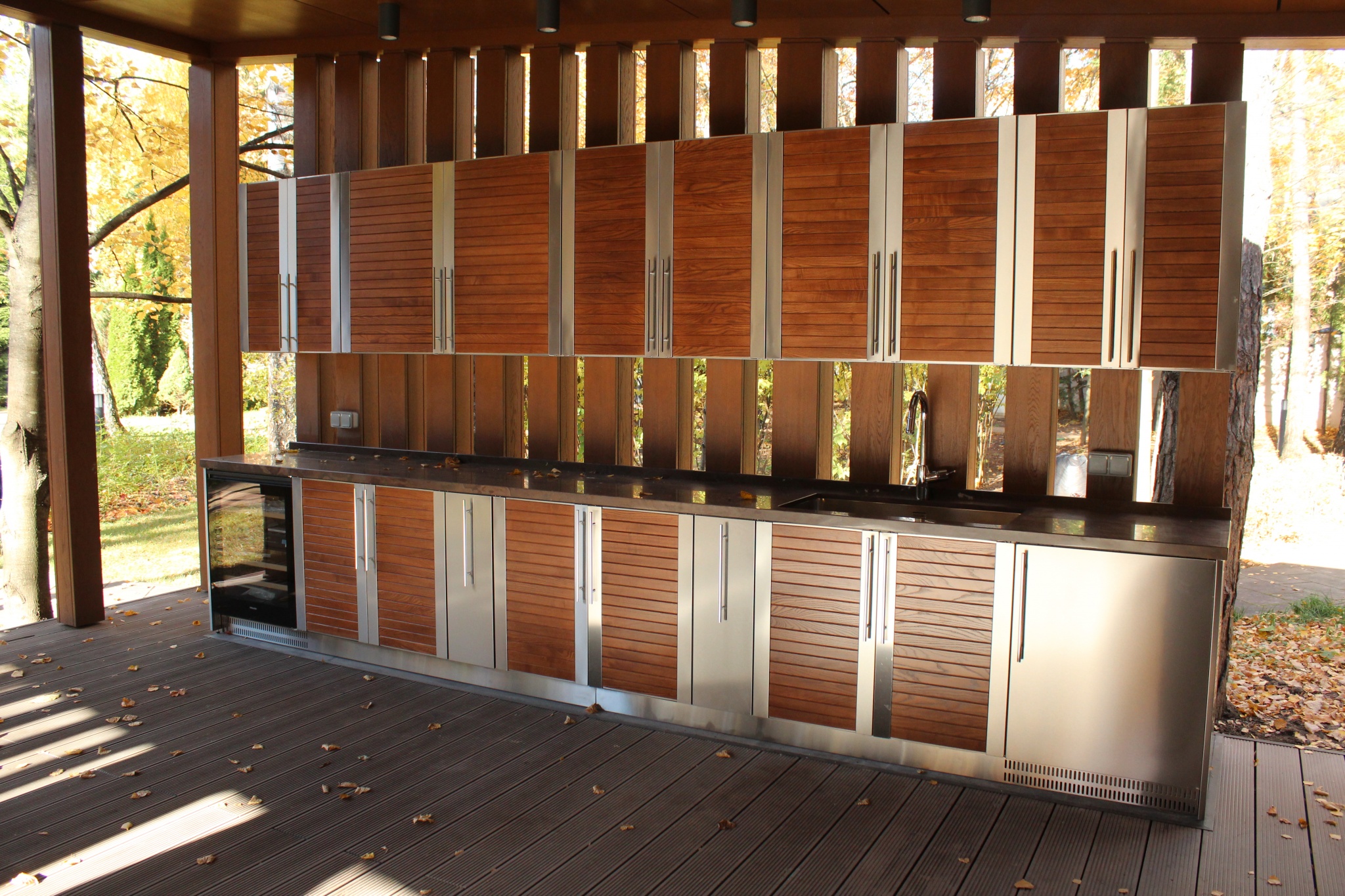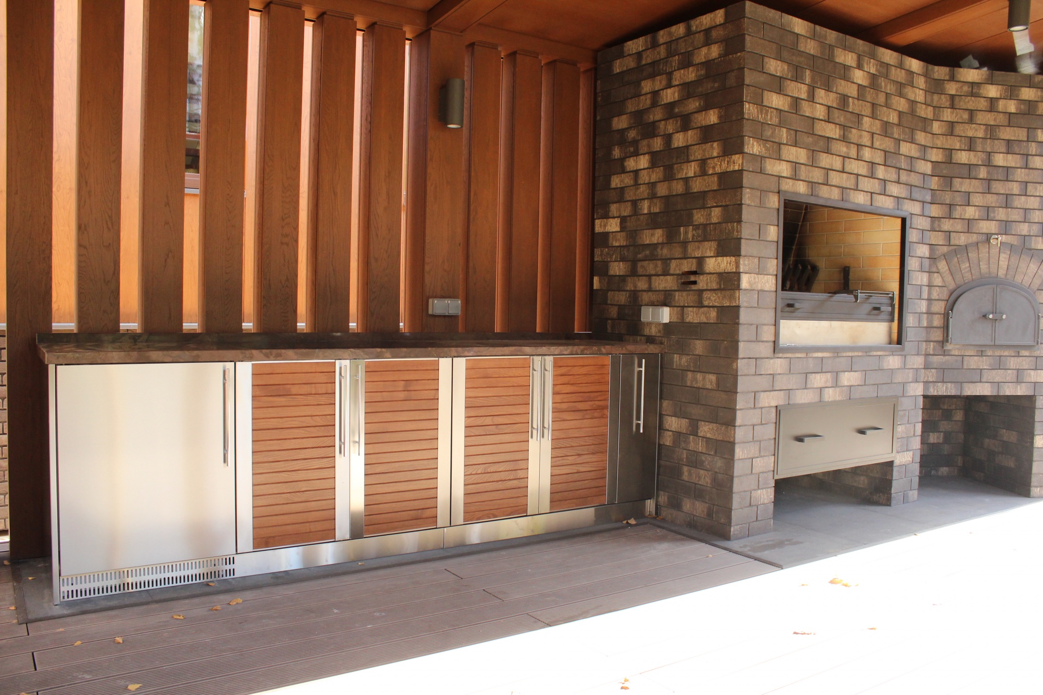 Нержавеющая сталь превосходный материал по коррозионной стойкости и долговечности! Все это позволяет, исходя из Вашего желания, "собирать" любые летние кухни и зоны барбекю по принципу Домино. Дополнив их любым профессиональным или бытовым оборудованием, разнообразными встраиваемыми или интегрированными в общий фронт грилем и/или тандыром, получаем удобную зону приготовления на открытом воздухе. Возможно исполнение как полностью открытый кухни, так и на веранде!